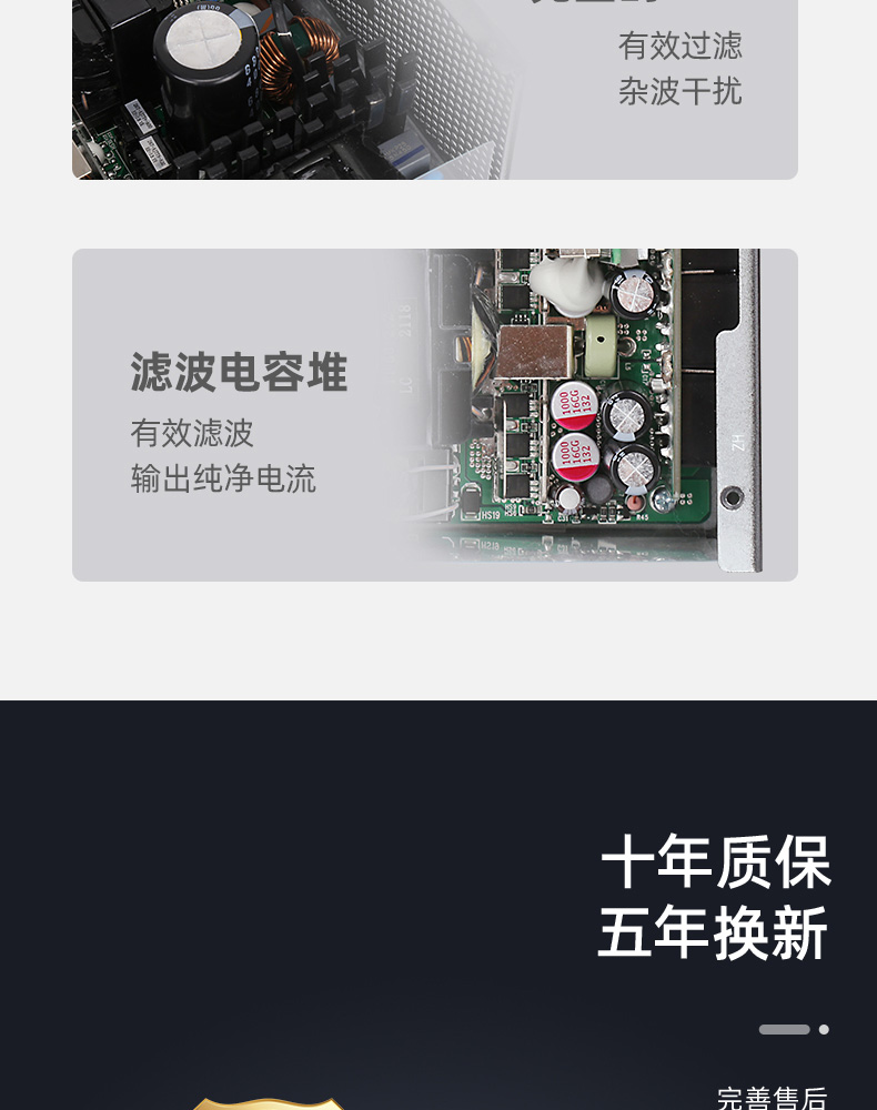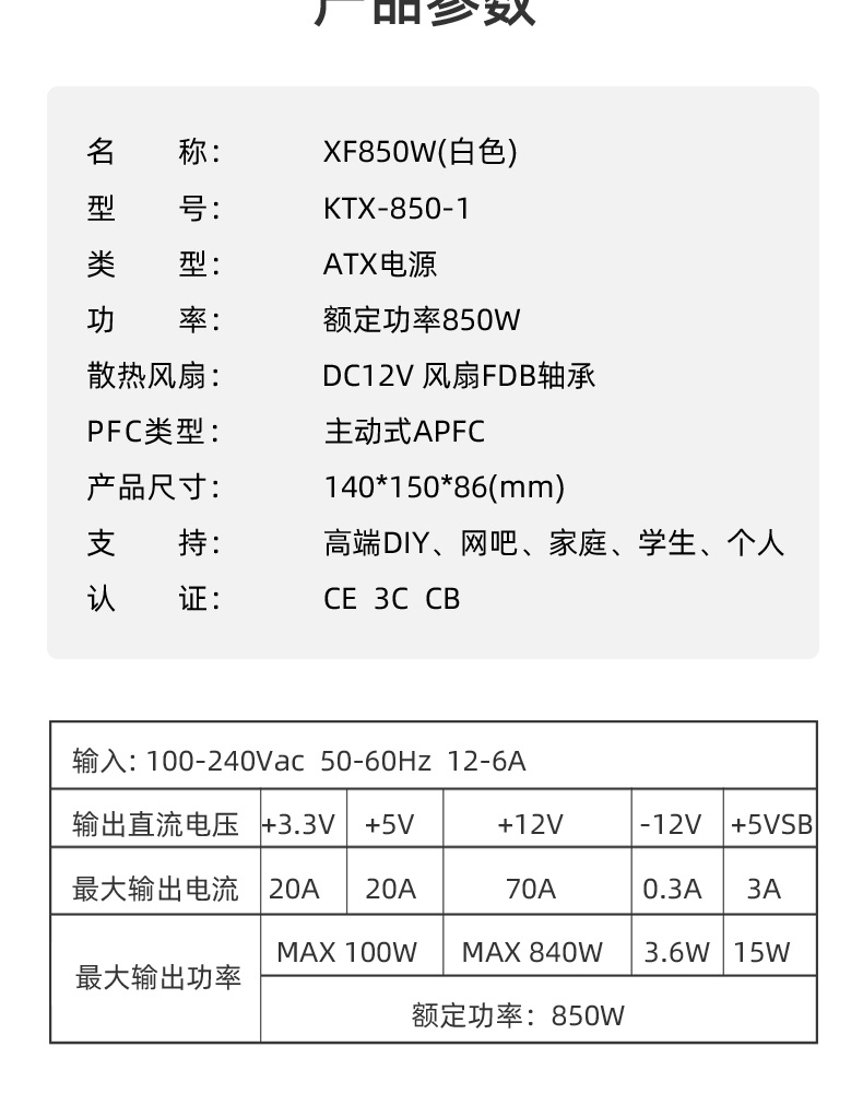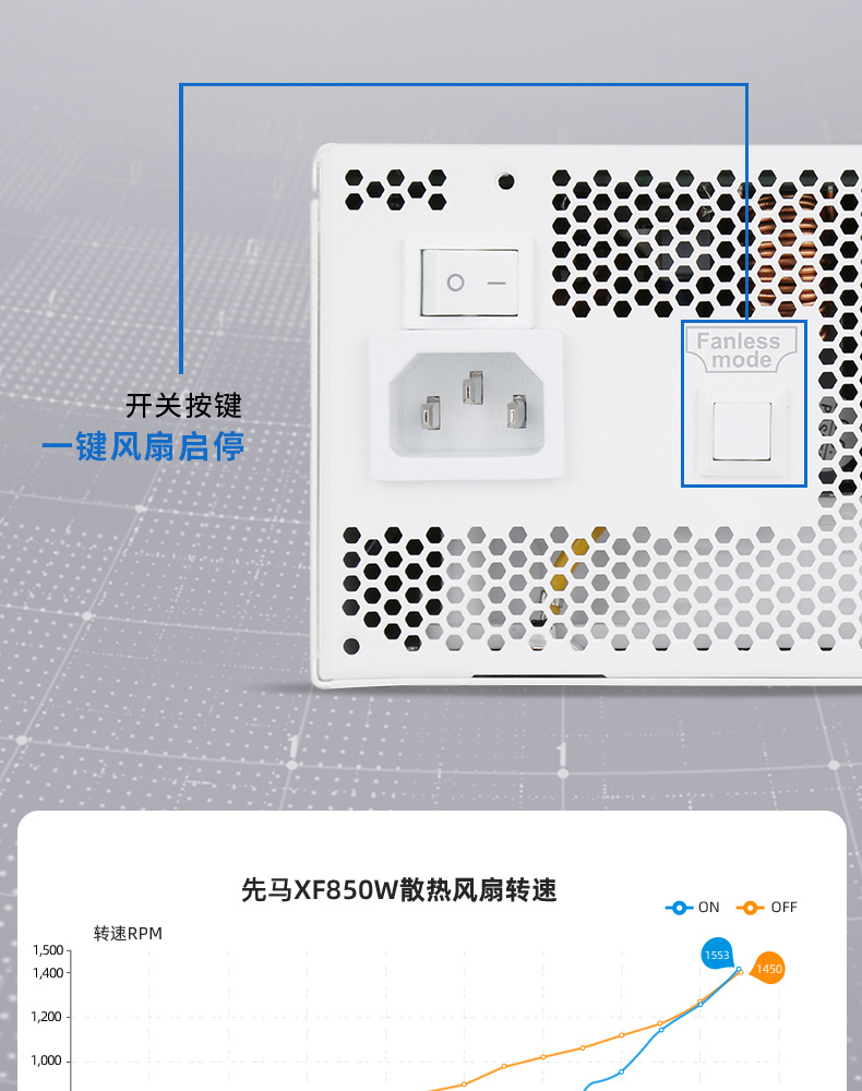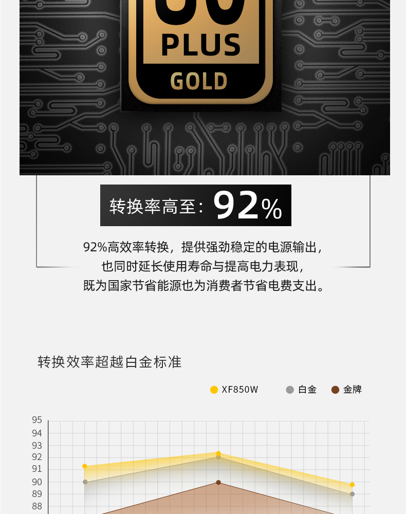額定850W,80PLUS金牌認證,全能模組,高品質(zhì)日系大電容,風扇一鍵啟停