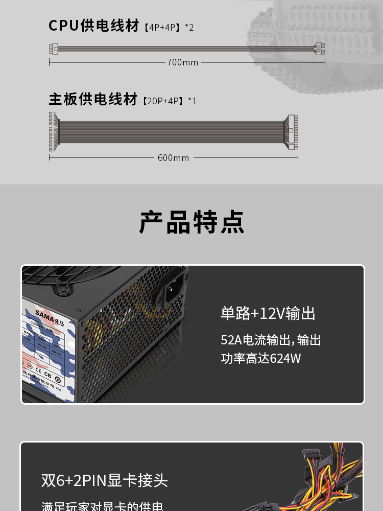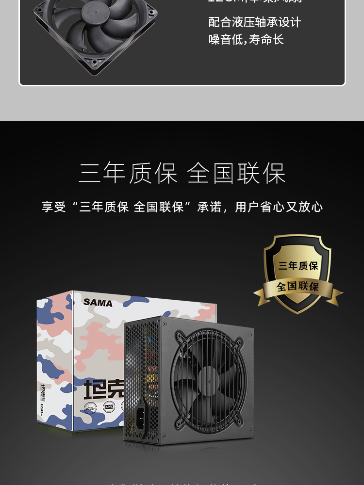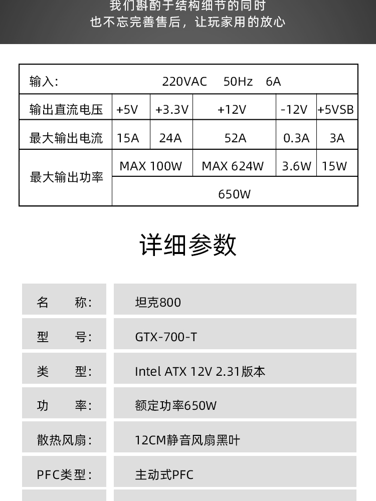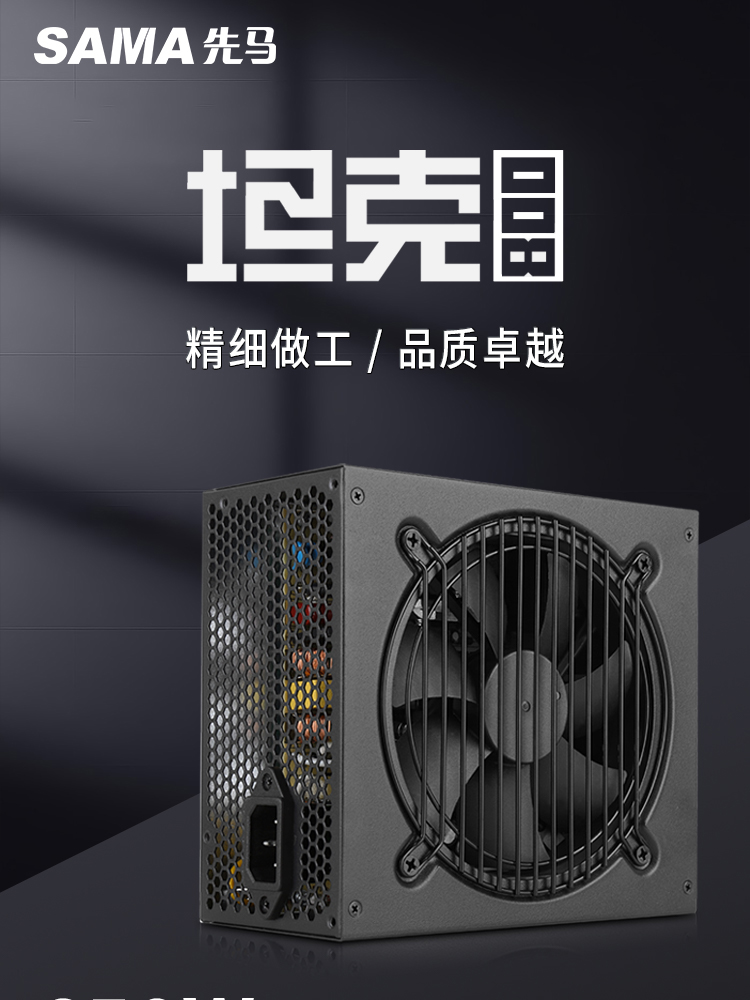 先馬SAMA 坦克800高級游戲電源(額定650W,+12V輸出,主動PFC,12CM靜音風扇)額定功率不虛標,+12V輸出很強勁,6+2Pin暢爽競技,12CM散熱風扇清爽自在