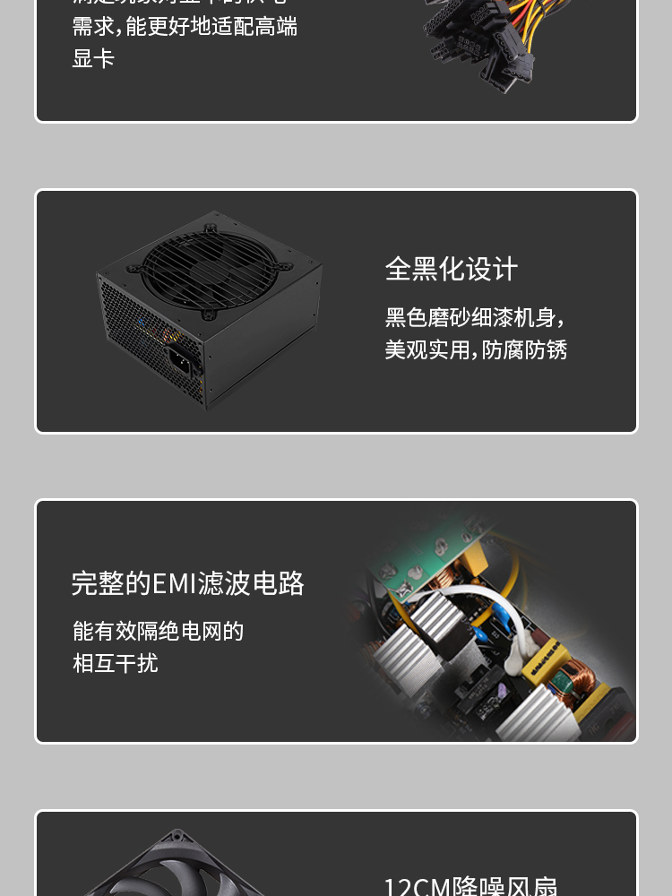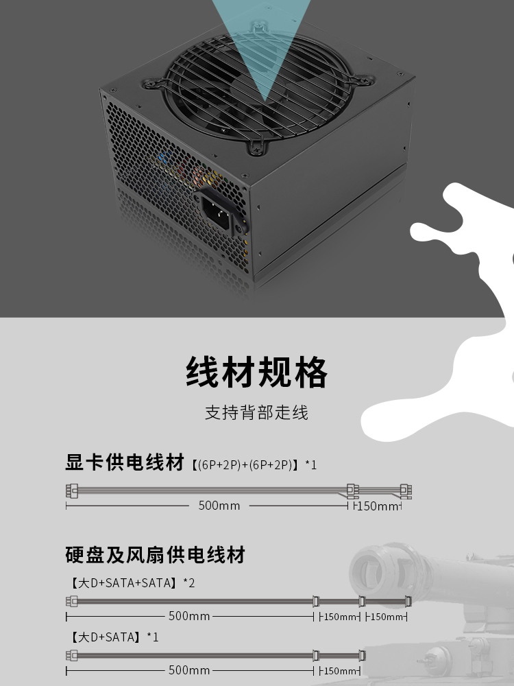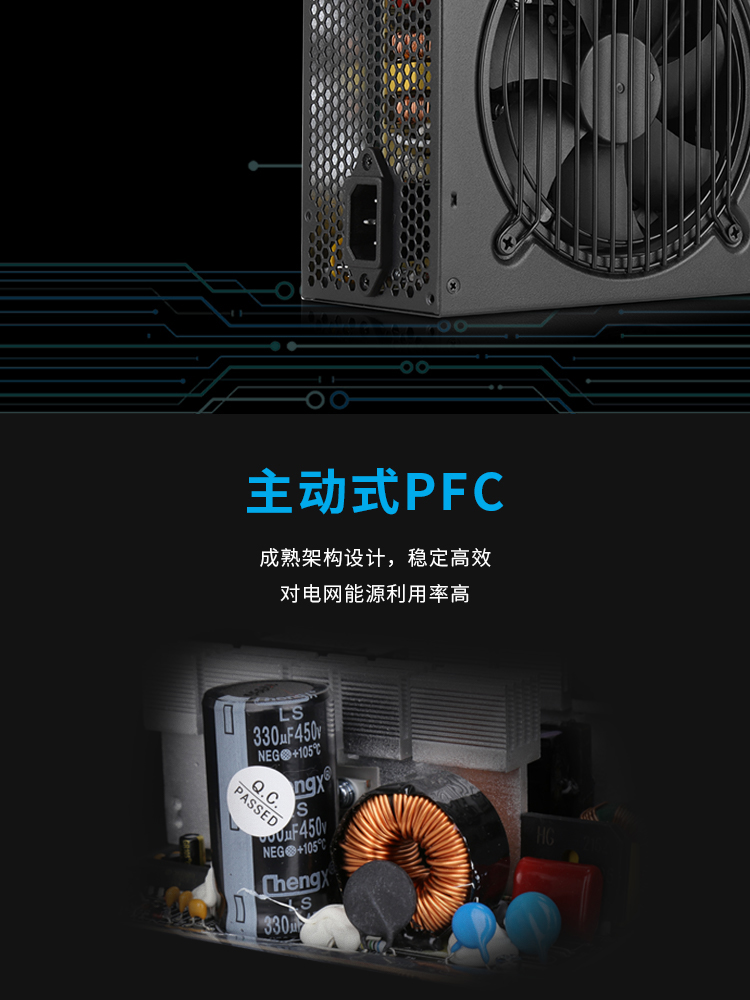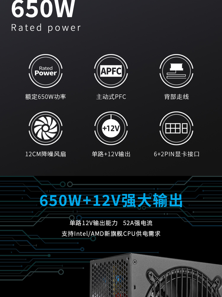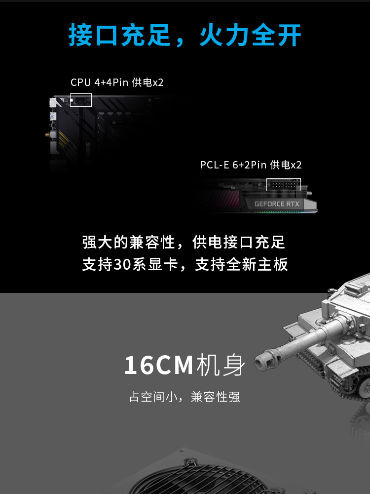 先馬SAMA 坦克800高級游戲電源(額定650W,+12V輸出,主動PFC,12CM靜音風扇)額定功率不虛標,+12V輸出很強勁,6+2Pin暢爽競技,12CM散熱風扇清爽自在